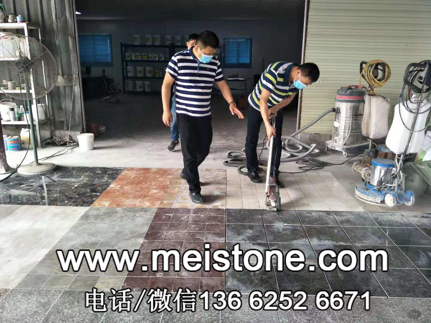 单先生之前是在广州某物业管理公司工作的,在工作的过程中也有做过石材后期的保养,但是对于需要打磨翻新的石材不知道如何去做。通过多方了解,来到我们广州美石培训基地学习石材打磨翻新镜面处理技术。因为现场橙皮红大理石粗磨后表面产生了裂隙和孔洞,所以采取了干磨回填抛光技术。花岗岩采用水磨抛光处理技术。下面为学习现场: