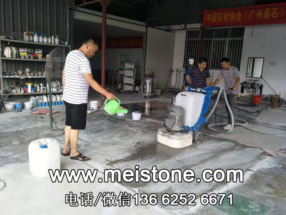 水泥地面真的能做出光亮效果吗?真的能做出如天然石材一样的清晰光泽度吗?答案是肯定的。为什么呢? 且听美石为您一一道来--- 大家都知道石材作为高档装修材料是可以通过打磨抛光晶面处理做出非常透亮的光泽,那我们要了解石材抛出镜面光泽需要什么条件? 我们知道石材要做出镜面光泽必须满足两个基本条件:平整度和密实度。所以只要水泥地面能满足这两个条件,做出镜面效果也就不难了。美石用12头研磨机配合金钢石刀头、金刚石树脂磨片能把地面研磨出很好的平整度。其次,通过做固化回填修补工艺可让水泥地面孔洞完全修复且具有很好的密实度。这样就能把水泥地面研磨、改性成同石材同样的平整度、硬度、密实度。再通过物理抛光(美石砼地坪抛光磨片)和MS-5抛光膏渗透研磨抛光就能达到同石材一样的镜面光泽度。水泥地坪也因此越来越受到人们的喜欢。 昨日, 来自山东的李先生,湖北的赵先生不约而同的来美石培训基地学习地坪固化镜面处理技术,石材打磨翻新晶面处理技术! 李先生之前是在山东临沂专业从事医护行业的,偶然看到美石可以把普通水泥地打磨出很好的光泽度,清晰度,故特地过来学习这项技术。赵先生之前是在湖北仙桃专业从事水磨石生产浇筑的,他说用350水磨机打磨后光泽度不是很理想,且很多孔洞只能采用水泥重新修补,比较耗时、耗力。看到美石能把水磨石地面做出如天然石材的光泽度且修补轻松,修补效果很好,为升级技术,扩大业务范围,能给客户提供有价值的延伸服务。他特地来美石学习地坪固化,石材翻新晶面处理技术。学习现场如下图: