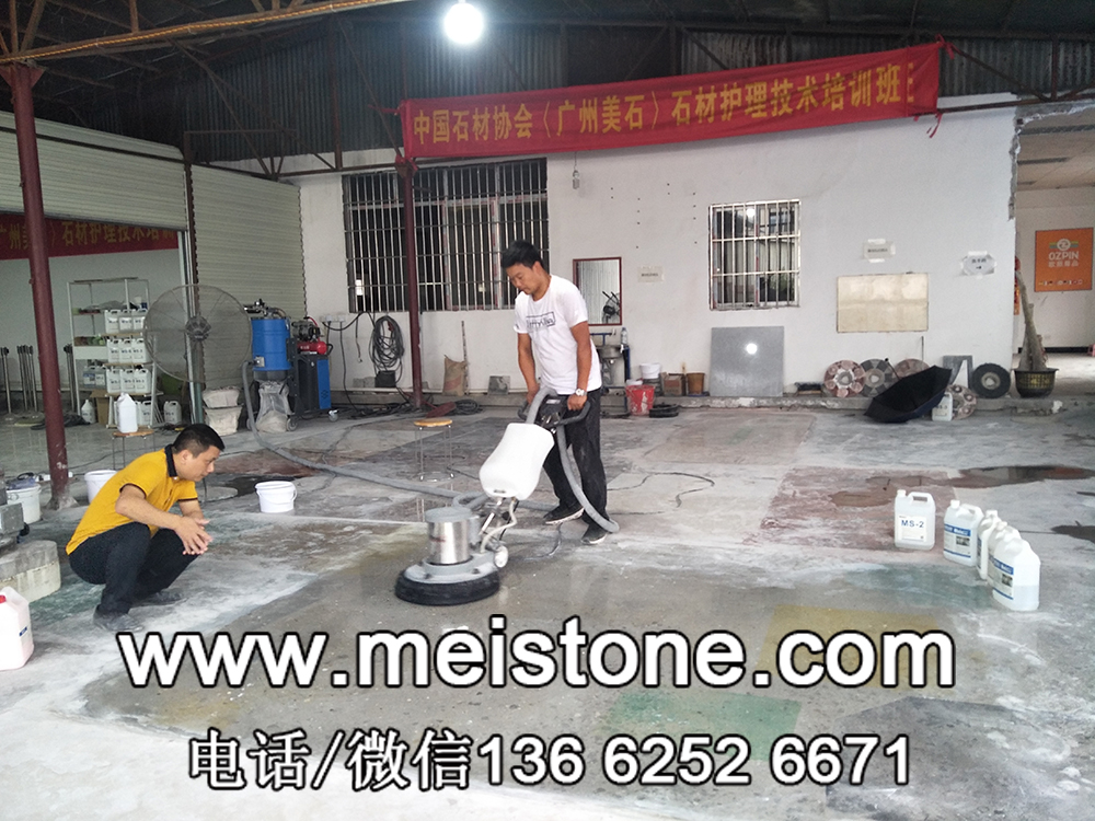 石材护理中,石材“基础光”即采用机器设备配合磨片研磨出来的光泽度。同石材厂家光面板的光泽度接近或相同。石材通过机械磨盘磨片研磨方式所达到的这种光泽,就是我们常说的石材物理抛光,而并非采用化学结晶等研磨方式所达到的晶面光泽。 在石材护理之晶面处理中,我们都想能快速、轻松做出石材表面的光泽度,来达到客户验收的目的。往往其耐磨损度倒不是石材护理人所追求的方向。但是,业主(客户)以问询方式提问石材护理人,你这效果能保持多久呢?事实上这能保持多久就是问我们的石材上晶面的耐磨耐踩度,即石材的硬度。我们知道硬度越高越耐磨损。 我们要想快速获得很好的镜面效果,怎样实现呢?这是很多刚进入石材护理行业的清洁保洁、家政公司做晶面护理时最常问的问题。 那么,我们要知道,石材是在各种地质作用下天然形成的。那我们要了解石材从开采到石材厂出售时光面是怎么出来的?其光面有什么特征? 石材是经过矿山荒料开采-运输-横(纵)向分片-定厚磨-流水线磨机配合磨块近20道程序粗细精抛而成的光面板(如下视频)。一般石材厂出厂的光面板都具有清澈、清晰、透亮的光泽。那我们要知道厂家光面板抛出这么好效果的因素有哪些? 1、石材厂家磨块研磨抛光时属于高、低压力(可控)接触式研磨与抛光。 2、磨抛程序逐级相隔紧密,譬如36#、60#、120#、240#、320#...3000# 磨块磨片中碳化硅或金刚石颗粒逐渐变细,在磨块的高速旋转下,线速度加大,若干点变成线,线组成平面,使得石材变成平整表面至最后出光。 3、磨片成分与品质与石材护理磨片有不同。 4、磨盘转速高,均达1000转左右。线速度超大。 以上条件使得石材抛出了清澈透亮的的光泽。这种光泽的抛光原理是:一种物理抛光是高速研磨,是机器高速研磨磨片中的树脂、金属氧化物等抛光剂在高温、高压下在石材表面产生流布运动和重新排列,形成了坚硬的热塑层和热熔层。具有很高的平整度和一定耐磨损程度。 而我们所做的晶面处理是化学药剂抛光,属于低速研磨,大多都是酸蚀作用与蜡在石材表面的氟硅酸盐与蜡的共混晶体层,其中有部分是填充。 那么、往往是当石材的光面表面出现磨损后,有划痕、或橘皮现象等,光度开始下降,意味着石材表面不平,有若干的细小的凹坑。要想还是利用的结晶粉、结晶剂做晶面处理很难做出镜面效果。这时唯有将石材打磨抛光出其基础光面,有了基础光面同时也具备石材表面的平面及光泽。我们知道平面镜,成为镜子,首先得要有超级的玻璃平面,然后才能辅以反光材料。同理,石材要想抛出像镜子一样晶体面首先得将石材磨平,磨出石材出厂时的光面板光泽,在此基础上做结晶处理才可获得很好的平整的镜面效果。这时,就必须在现场做石材的整体研磨打磨抛光了。 为使石材现场整体研磨抛光达到与石材出厂时光面板一样光泽度,美石开发出了美石砼大理石1#、2#、3#、4#、5#磨片(如下图),5道程序研磨与抛光,1#-3#水磨,4#-5#干磨,磨片磨出的光泽度可达60-80度(石材材质不同,光度不同),在此基础上再通过化学药剂研磨抛光,可使石材光泽度达到最佳的效果:柔润、厚实、晶体感呈现明显。同时其硬度超过以往结晶剂、结晶粉做出的晶面硬度。此晶面剂是一种石英膏,抛膏处理即纳米氧化硅在石材表面的渗透成膜技术。有坚实的硬度和清澈的光度。使用寿命远高于第二代大理石护理剂、结晶粉。既适用于大理石也适用于花岗石、红砖,混凝土表面的镜面抛光处理。 目前,在结晶材料中,如用于商场门口的大理石地面,水剂型一般只能维持3-6天左右,膏剂一般可以维持30天左右。当地面的光泽度下降至50-60度时,就要进行结晶保养;如果光泽度下降到30-40度时,仅用结晶方式已经不能恢复大理石的镜面效果,只能通过整体研磨翻新才能恢复石材的基础光面。如果石材磨损非常严重,就要进行深度翻新或修补。 河南郑州的庞先生之前是在郑州专业从事清洁保洁的,他说他只是偶尔做过石材晶面护理,买了很多种结晶剂、结晶粉、抛光剂都做不出理想的效果,抛不出人家星级宾馆大堂大理石那种镜面效果,通过多方了解来到美石培训基地学习石材打磨翻新护理技术和地坪固化抛光技术。通过在美石学习理论知识和实操的系统的训练,他走出了任何石材只要用好的结晶剂、结晶粉抛光剂就能抛出清晰光泽度的误区。学习现场如下图: