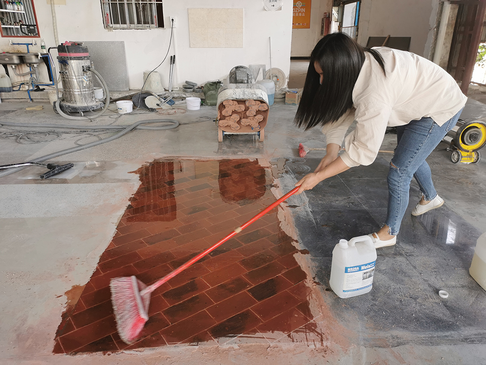 广西玉林覃先生做水磨石浇筑多年,但是只局限于传统水磨石生产工艺,对浇筑完的水磨石进行了粗、细,精的三道打磨。水磨石表面没有光泽,且日久易受污染和起尘。他的朋友杨先生看到我们美石基地把水泥地坪、混凝土地坪、普通红砖做出像镜子一样漂亮,就立即给覃先生看,覃先生看到美石的水磨石红砖镜面效果之后,立即驱车赶来美石基地学习新技术—固化、晶面处理技术。