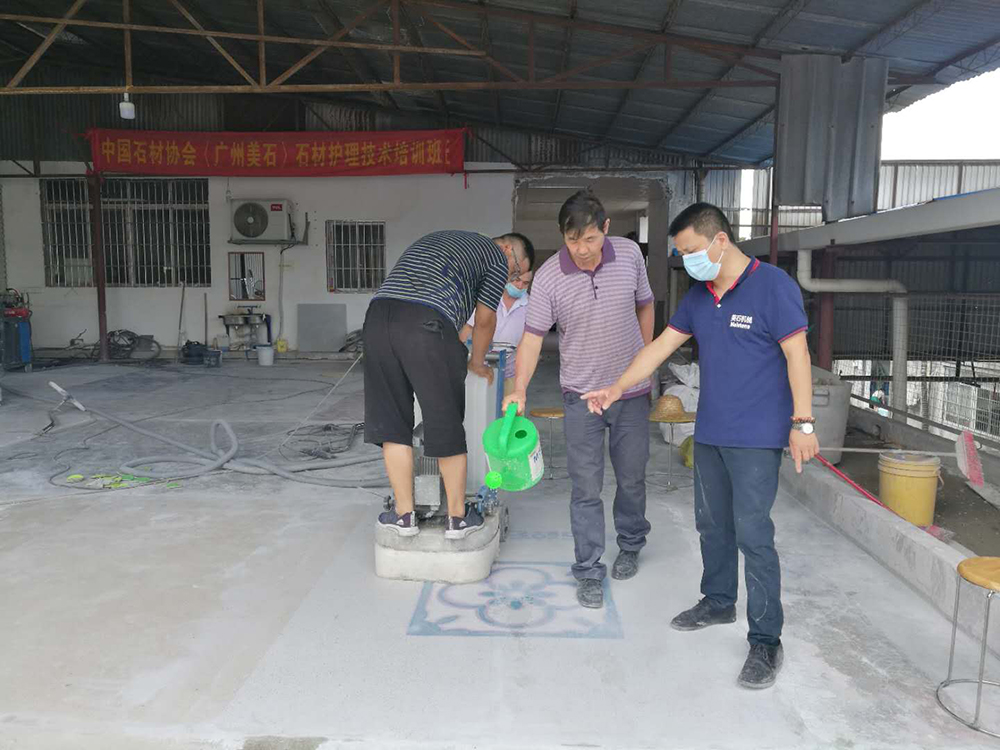 天津滕先生专业做家装十多年,在为业主服务过程中,经常有看到专业石材护理和地坪打磨固化施工的队伍也上门为家庭或业主服务。滕先生也想为了客户提供专业的延伸服务,配套服务,就决定投资增加石材护理、地坪固化处理项目,通过查询,得知美石专业提供技术配套服务,所以找到美石培训基地来学习新的项目技术—地坪固化石材晶面处理技术。 南京刘先生做混凝土固化地坪一年多,由于在修补孔洞方面技术不够成熟或从未接触过,所以带着员工一起来美石培训基地学习专业的地坪修补技术和美石砼研磨成镜系统 广州刘先生做石材护理有十多年了,由于想多方面发展,学习混凝土固化处理技术,也找到美石培训基地学习地坪固化成镜处理技术。 惠州黎先生专业做红木家具维修护理10多年,生意不错,但总感觉项目生意单价太小,没法壮大事业,同时,经常在各种现场作业中,看到他人在做固化地坪,染色地坪,磨石地坪,通过简单的了解,觉得这是一个不错的项目,有很大发展潜力,通过找寻,也找到了美石培训基地学习地坪固化晶面处理技术。他们一行7人于6月17日不约而同来到美石基地学习地坪固化成镜处理技术、磨石浇筑技术、石材护理技术。 如下图及视频