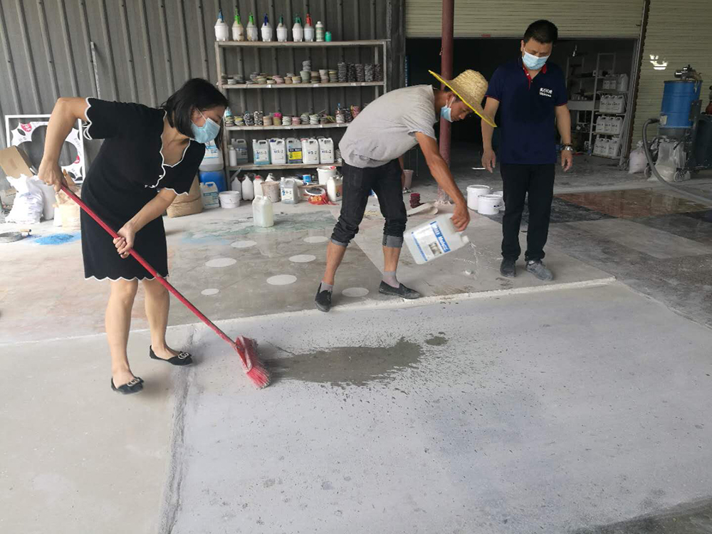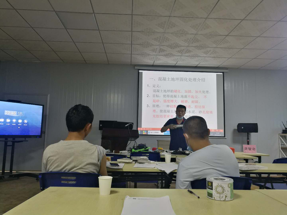 6月20-22日,贵州黎平吴先生和广东云浮邱先生来美石培训基地学习地坪固化处理技术 贵州黎平吴先生是专业种植茶树开茶园的,也有自己的茶叶加工厂。茶业工厂水泥地面经常起灰起尘,不适盒晒茶叶干净卫生需求,别人家的茶叶厂里地面干净、光亮。经了解原来是做了地坪固化处理,吴先生想首先把自己厂里地面做好打磨抛光处理,同时也能帮同业厂里的水泥地面做抛光处理,经多方了解到:广州美石专业培训地坪固化抛光技术,于是带着家人石先生一同来到美石培训基地学习美石砼地坪固化研磨抛光系统以及镜面处理技术。 广东云浮邱先生、李先生是专业做外墙涂料喷涂、外墙补漏和水磨石生产的。但是觉得自己做出来的水磨石总是灰头土脸的,不像别人家的那么光亮如大理石,经过了解,来到美石培训基地学习混凝土地坪固化处理技术。