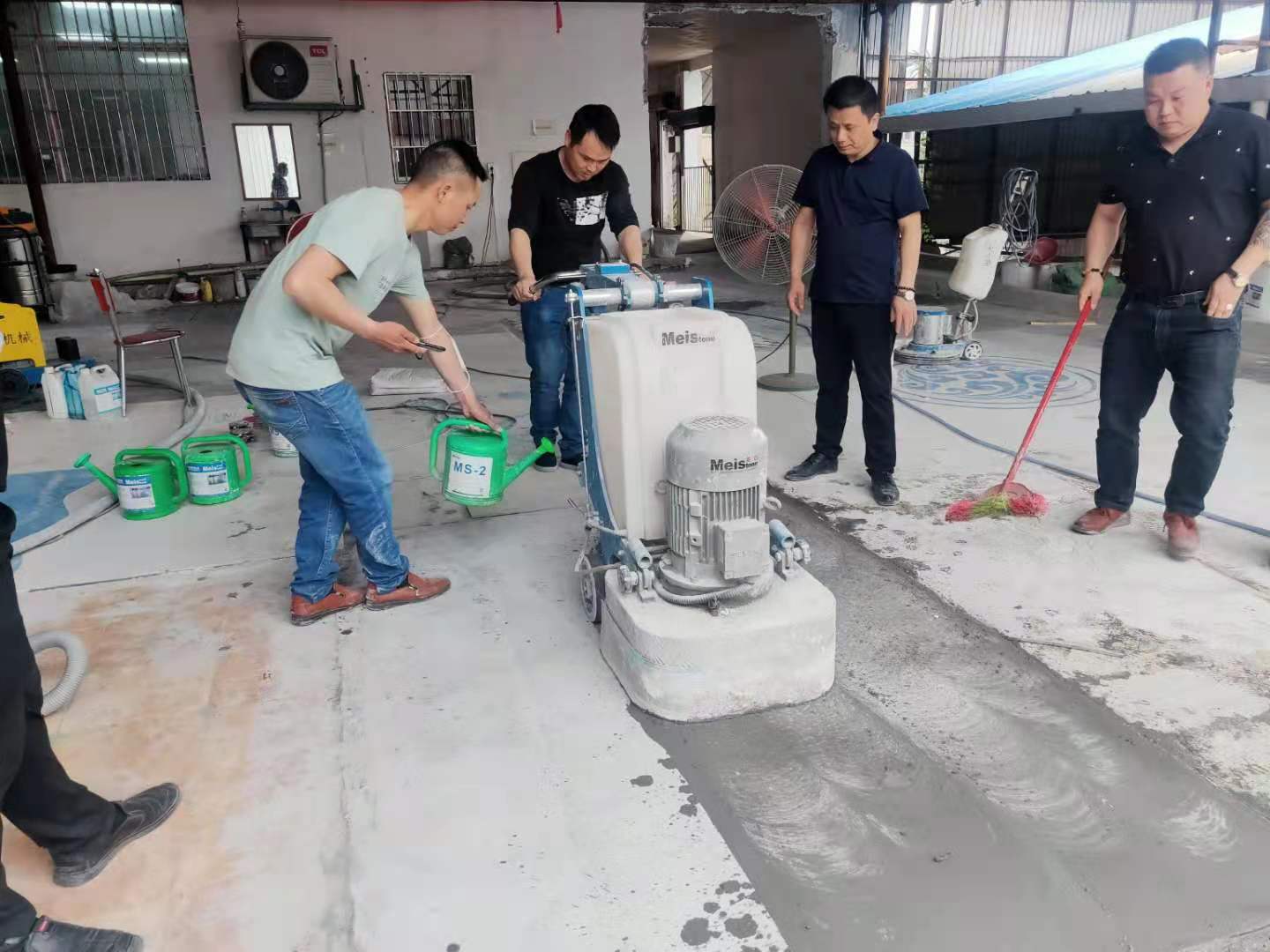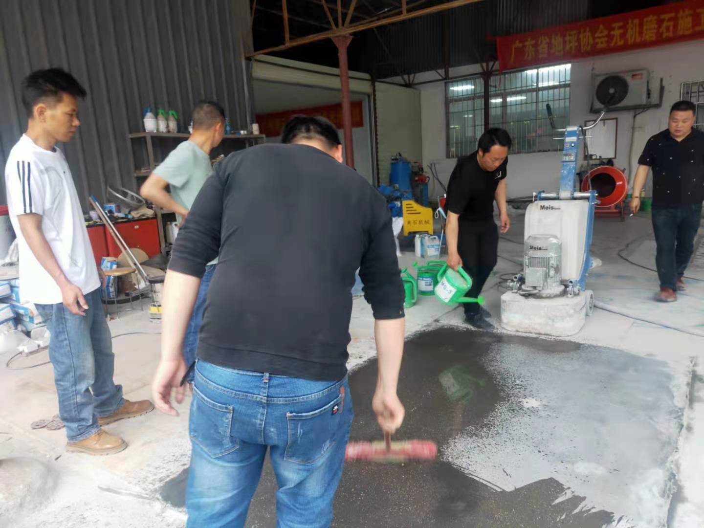 在云南、湖南、浙江、江西、广西专业从事水磨石生产,建筑10多年的客人见识过同行做的水磨石与自己不同,感觉耐磨、又亮好看。经过找寻,于4月15日同来美石基地学习混凝土、水磨石固化研磨抛光成镜处理。美石基地龚老师和学员们认真讲解了混凝土、水磨石、红砖研磨固化、修补修复技术。艺术磨石制作技术和固化处理、镜面处理实操训练。 学员们在实操镜面护理机械时,都特别认真,花多了一点时间操练。因为他们都没有镜面机械操作经验,许从零开始学习,龚老师非常耐心的讲解晶面机结构原理、操作基本要领,操作技巧,手把手一个一个教,首先从光地低摩擦力研磨开始练习、循序渐进。同学们反复练习,直到完全掌握要领,熟练操作。最后,学员们都问到墙边总有一点磨不到的地方,怎么研磨到位?龚老师都亲手示范怎样磨角位和墙边,同学们都认真训练采用修边机配合金属刀头、树脂磨片零距离研磨混凝土墙边操作!(如下图)