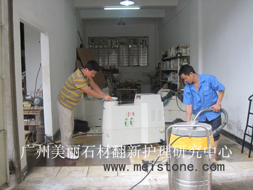 广州市美丽石材翻新护理研究中心是一家专致于石材翻新养护设备的研发、生产和销售、石材养护技术开发与培 训,提供专业石材翻新护理、防护工程服务,清洁剂、清洁机械用品生产、销售的综合型实体企业。从事石材翻新护 理研究和服务十余年,积累着丰富的施工经验。花岗石打磨翻新护理是我公司的强项和新技术。 花岗石为什么需要打磨翻新? 花岗岩(石)有很多种,其中我们见得最多和普遍的是麻石,麻石又有很多种。例如深灰麻、山东白麻、美国白 麻等。其主要由石英、云母构成,其主要成分为二氧化硅、硅酸钙等物质。摩氏硬度值为 6.5 左右,质地坚硬。所以 一般新铺的各种花岗岩地面使用 2-3年还是光亮如新,除非采用了错误清洁保养方法或一楼人流密集的地方就容易失 去光泽。花岗石地板石材长期使用也照样容易出现和磨损、孔洞、橘皮现象,亦即回归到原来的毛板或粗加工状态, 这时就产生了地面花岗岩的打磨翻新、抛光与护理的需要。请浏览下面视频及图片。 花岗石翻新需要选用的机器设备? 花岗石的磨损,其主要表现为表面的人工加光晶体层磨损、云母脱落、凹陷。此时石材表面有少量凹入的麻点出 现,当麻点不断增多时,花岗岩表面光亮度下降,失去原有光泽,用手触摸时有凹凸感,像橘子表皮一样,就是我们 常说的花岗岩橘皮现象,所以使用重型美石石材翻新机配合花岗岩加工时所用的特殊磨块打磨翻新抛光花岗岩就可还 原石材出厂时的高光亮度的晶体层。 花岗石翻新需要采用什么方法? 由于花岗石质地坚硬和其化学分子结构决定的特性,故其表面受损时单纯使用化学类养护剂、研磨剂等进行养护 很难达到理想效果,即使有一定得光洁度都是暂时性的附着物性质的光亮层。而只有运用重型的美石石材翻新机配合 石材加工专用磨具采用物理研磨方法,其效果要远远好于单纯使用化学类产品进行研磨加光,其才是真正的花岗岩翻 新或再加工。同时使用物理研磨方法打磨翻新必须满足三个条件 。 花岗石翻新需要具备哪些条件? 第一、翻新机的重量必须在200—250公斤; 第二、翻新机磨盘的大小为:粗磨(首道工序)磨盘直径为25-30厘米,第二道工序开始至抛光磨盘直径应为35 -60厘米。磨盘转速必须在400转/min(粗磨、细磨)和900转/min(抛光)左右。也就是说,在石材研磨工序中需要重 量和低转速这两个必要条件。 第三、在抛光出亮度的工序中,根据磨盘的大小需要相应的一定的磨盘压力【即机身前端重量(可调节)】和高 转速和磨抛的火候条件(即时间控制与干湿控制)。目前市场上使用的普通加重机因重量低、转速低(150转/min, 中国电压),无法满足花岗石翻新物理研磨所需的必备条件,所以花岗岩打磨翻新后出现波浪、剪口斜坡现象,效果 很不理想。因此,我们推荐选用meistone美石石材打磨翻新机。(如下图)美石石材翻新机进行花岗岩的打磨翻新, 其重量有250KG,转速400-800转/分,可挂挡调速,操作方便,满足花岗岩翻新所需条件,翻新直接磨块抛光后的花岗石 光亮度在85-90度以上,完全接近原石材出厂时的光亮度。可浏览我公司花岗岩详见优酷网花岗岩磨抛视频。 花岗岩翻新所需设备、配件及耗材:开缝机、灰刀、云石胶、防水剂、4 寸或马蹄形树脂金属粗磨片(块)、树脂 磨块、白色抛光垫、吸水机、告示牌、水鞋、喷壶、测光仪、玻璃刮洗器和水桶等。 花岗岩翻新工作程序及施工方法 ①在工作现场设立告示牌,为防止泥浆污物溅到墙壁,用塑料透明薄膜把地面围墙壁底部贴好。 ②勾(切)缝、防水、补胶。 ③重型石材翻新机配合磨块低速研磨。 ④重型石材翻新机改变重量(亦即降低磨盘压力)配合磨块高速抛光 ⑤加重机配合白垫、钢丝棉、中性树脂型晶面剂研磨-----晶面护理。