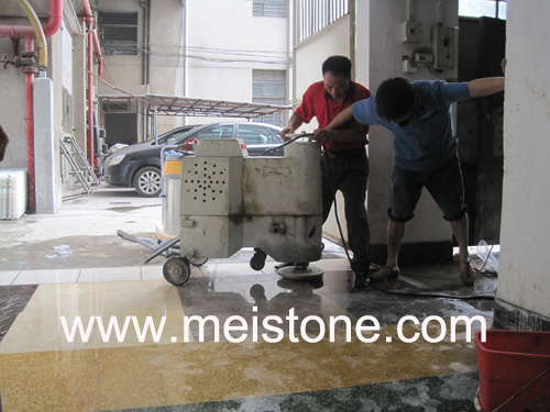 在广西北海刘先生、黄先生来我公司学习整套石材翻新护理技术时,现场进行了印度红花岗岩打磨整 平抛光技术讲解、演示和亲自实操。发现花岗岩地面石材的现场打磨抛光是不需要做晶面护理可以直接达 到85-90度光度,就是采用美石石材翻新机配合机花岗岩白抛磨块直接抛出光度可达85-90度,这一突破性 发现是刘先生、黄先生做保洁和石材晶面护理多年以来的重大发现。眼见为实后,立即定下了我公司的美 石6A石材翻新机、美石晶面机等石材护理设备和工具材料。如下图。