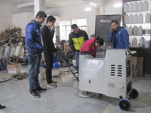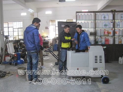 我公司陆师傅与陈先生探讨大水牛机器知识 使用大水牛机器打磨水磨石地面现场